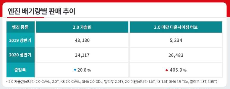카이즈유 데이터 연구소에 따르면, 2020년 상반기 2.0리터급 엔진이 장착된 중형차 판매량은 3만4117대를 기록해 전년대비 20.8% 감소했고, 반면, 2.0리터 이하 다운사이징 터보 모델(쏘나타·K5 1.6 터보, 말리부 1.5·1.35 터보, SM6 1.6 TCe)의 판매량은 같은 기간 405.9%나 증가한 2만6483대로 급증했습니다.