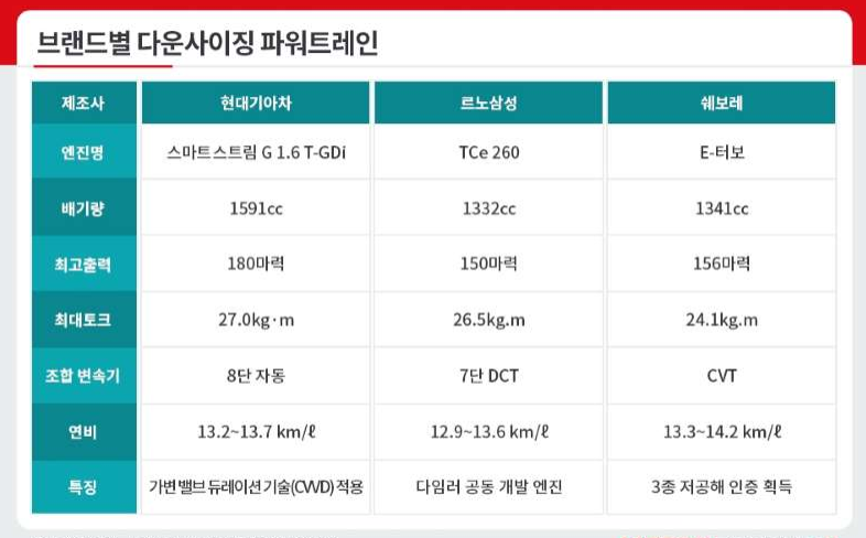 이 같은 열풍은 ‘무난함의 대명사’인 국산 중형 세단까지 이어졌습니다. 앞서 현대기아차가 쏘나타와 K5에 1.6 터보 라인업을 선보였고, 쉐보레 말리부가 1.5 터보 엔진에 이어 한 발 더 나가 1.35 터보 엔진을 장착했습니다. 르노삼성도 최근 SM6 부분변경 출시를 통해 1.3 및 1.8리터급 터보 엔진으로 재구성했습니다.