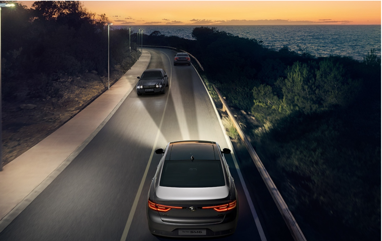 르노삼성 sm6 페이스리프트 모든 트림에는 LED 퓨어 비전 헤드 램프가 기본으로 적용되었으며, 동급 최초로 LED 매트릭스 비전 헤드 램프를 선보입니다. 이는 전방 카메라가 주행하고 있는 주변 상황을 스스로 인식하고, 좌, 우 각 18개의 상향등 내부 LED를 다중으로 제어하여 영역별로 밝기를 정교하게 조정하는 기능입니다.
