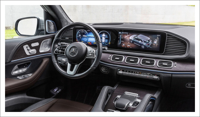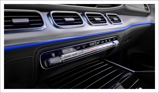 #더뉴GLE 실내는 SUV의 이미지를 지키면서 세단의 럭셔리하고 우아한 분위기를 풍깁니다. 특히 중앙 모니터 좌, 우에 자리 잡았던 송풍구는 형제 모델을 따라 모니터 아래에 위치합니다. 계기판과 중앙 디스플레이는 모두 12.3인치로 한 개의 베젤로 이었고, 또한 앰비언트 라이트는 개인 취향이나 기분에 따라 64개 색상 중에서 선택할 수 있습니다.