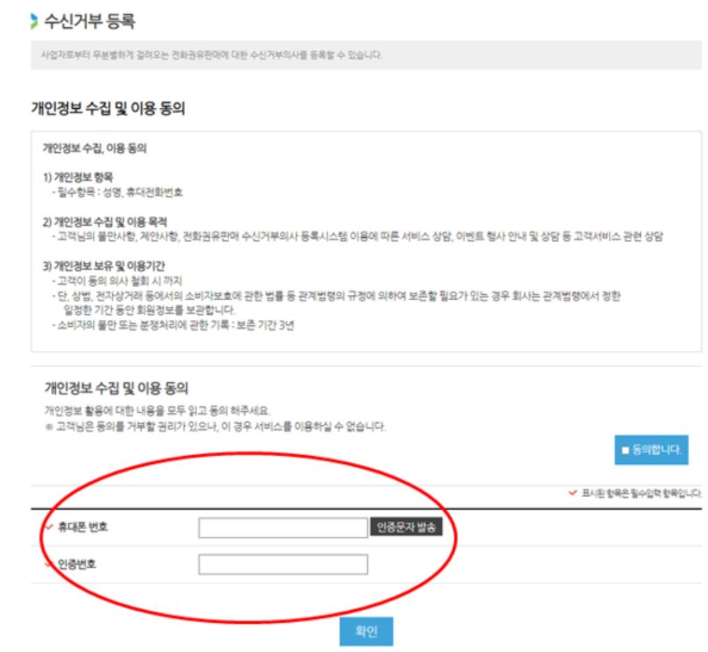 3. 그리고 ‘개인 정보 동의’ 후 자신의 번호만 넣어주면 한 번에 차단할 수 있어요