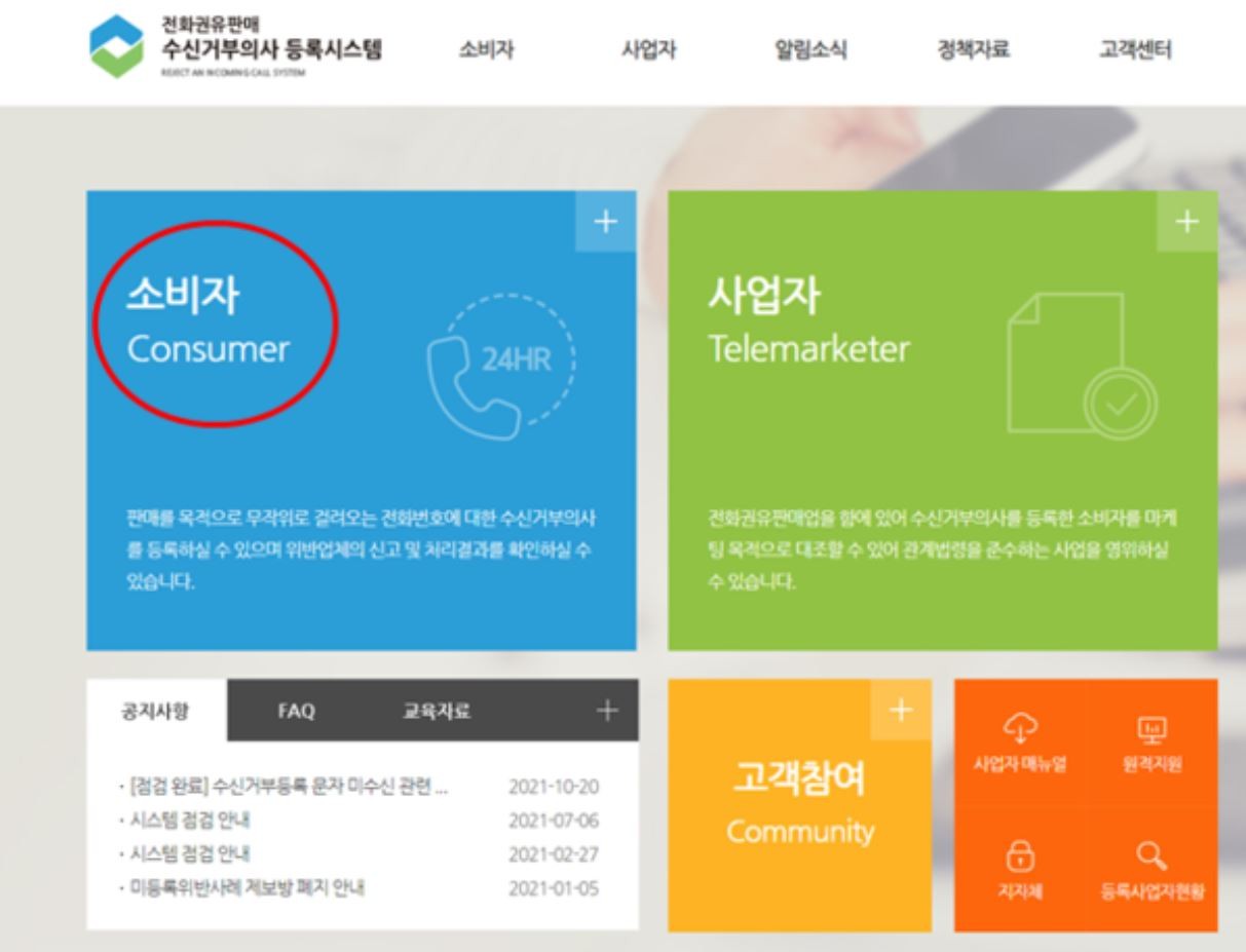 2. 사이트 들어가면 위쪽 파란색 소비자에서 ‘수신거부등록’을 클릭해 주세요