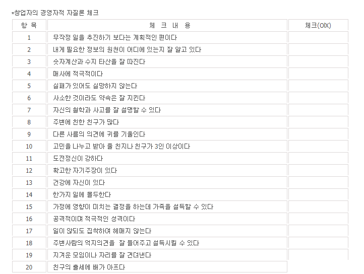 다음은 창업자의 기질을 체크하는 도표로서 최소 50%이상이 되도록 노력하여야 한다. 노력해도 않될 것 같다면 창업을 과감히 포기하라.