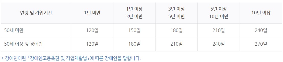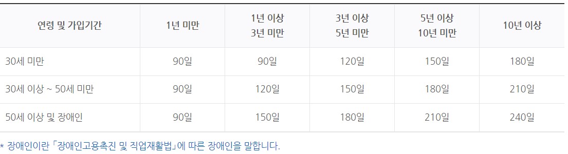 산정되며, 이 때 소정급여일수는 고용보험 가입기간과 퇴사 당시 만 나이를 기준으로