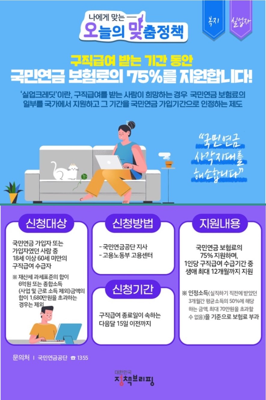 구직자 여러분들의 부담을 덜어드리기 위해 구직급여를 받는 기간 동안 국민연금 보험료의 75%를 지원해주는 실업크레딧 제도가있습니다.