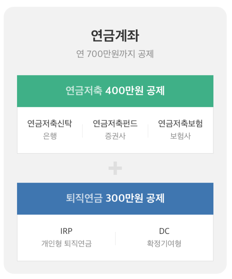 다만, 그 중에 세액공제 대상이 되는 것은 최대 700만원이기 때문에 한도를 모두 채워 납입하려면, 연금저축 400만원 + 퇴직연금 300만원 조합으로 가입하시길 추천드립니다.