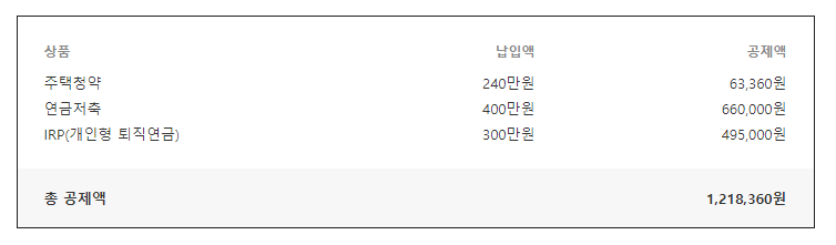 올해 소득이 3천만원인 직장인 A씨는 여유자금 940만원으로 주택청약, 연금저축, IRP에 가입하여 총 1,218,360원의 공제를 받게 되었는데요.