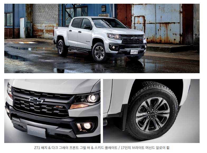 신형 콜로라도의 디자인 변경과 함께 오프로드의 느낌을 만족시키기 위해 프리미엄 사양을 더한 Z71-X 트림이 기존 트림에 새롭게 추가되었습니다.