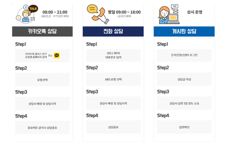 온라인청년센터가 제공하는 마지막 주요 기능은 청년상담실서비스입니다. 나에게 필요한 맞춤 정책이 무엇인지, 혹은 내가 원하는 진로와 취업에 필요한 정보가 무엇인지 알고 싶은 경우 등 청년들이 가지고 있는 궁금증을 해결해주는 서비스입니다. 온라인청년센터 카카오톡 채널이나 홈페이지 게시판, 혹은 전화를 통해서 실시간으로 상담 서비스를 받아볼 수 있습니다.