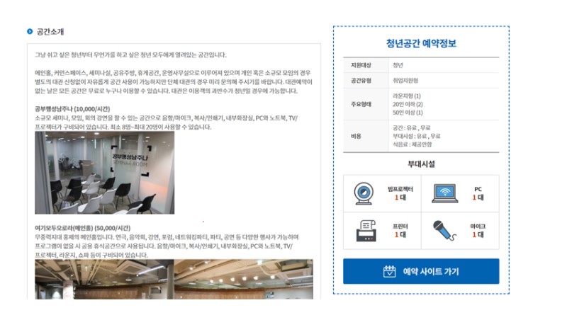 그리고 위 사진처럼 자신이 관심 있는 청년공간에 대한 자세한 소개와 내부 사진, 이용 비용 및 위치, 예약 사이트 등 상세한 정보도 접할 수 있습니다. 더욱이 각 청년공간에서 제공하는 취업, 창업 관련 프로그램들도 살펴볼 수 있습니다.