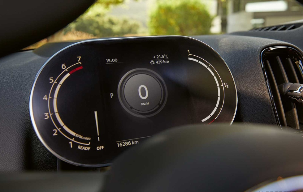 실내에는 타원형의 디지털 계기판이 탑재됐었고, 그래픽은 간결하고 단순한 편입니다. 센터페시아의 터치스크린은 표면이 피아노 블랙인데 커다란 원형의 무드램프로 마감돼 깔끔하고 모던한 느낌입니다. 스크린 아래의 여러 가지 토글스위치와 다이얼 모양의 조그셔틀은 귀엽다는 감탄사가 절로 나올 정도입니다.
