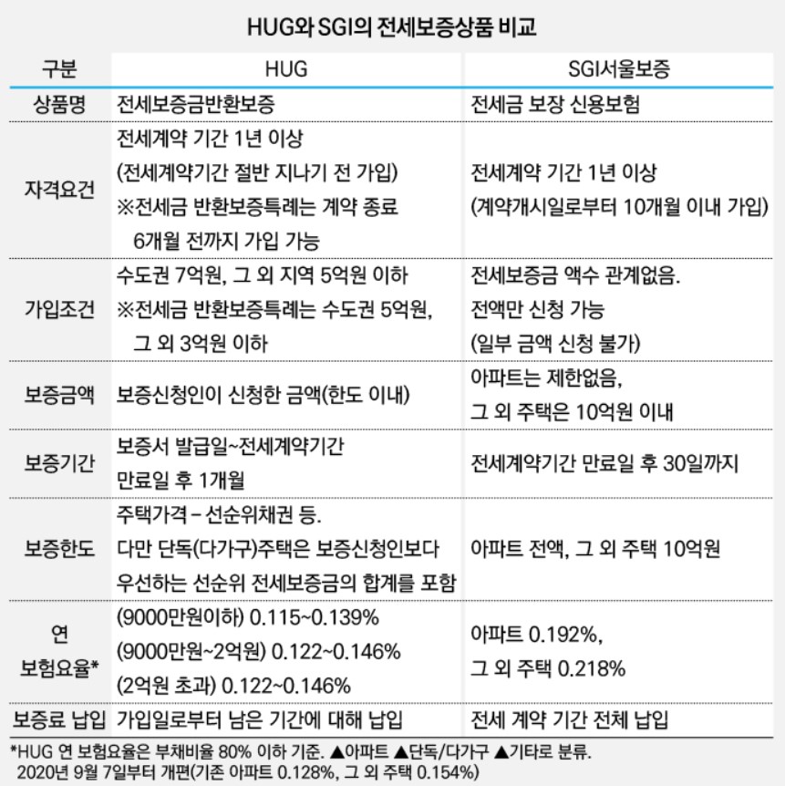 상품의 종류는 크게 HUG의 전세보증금반환보증과 SGI서울보증의 전세금 보장 신용보험으로 나뉘는데요. 기본 구조는 비슷하지만, 가입 요건이나 보장 금액, 보증료율 등이 다릅니다.