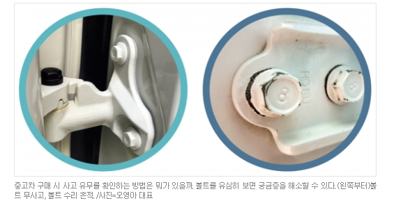 중고차 사고차량을 구분하는 방법 중 가장 흔히 보는 것은 바로 볼트와 실리콘 상태입니다. 볼트를 풀었다는