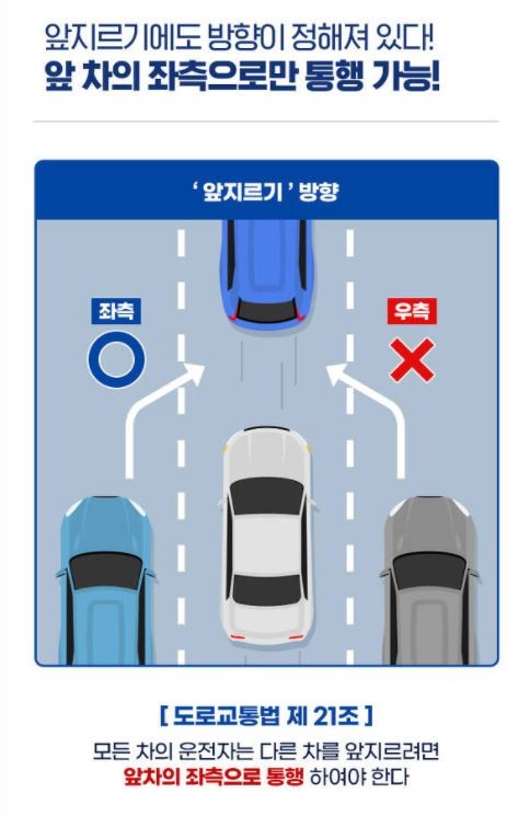 아무 방향으로나 이동해도 되는 진로 변경과 달리 우선 앞지르기를 할 경우에는 방향이 정해져 있습니다. 도로교통법 제 21조에 따라 모든 차의 운전자는 다른 차를 앞지르려면 앞차의 좌측으로 통행하여야 합니다.