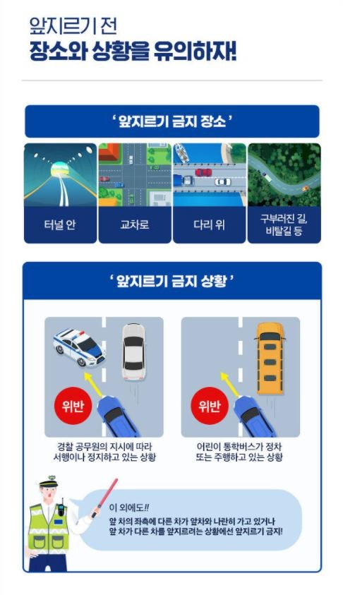 이외에도 비나 눈에 의해 놓으면 젖어 있거나 폭설 및 안개로 가시거리가 짧을 경우 앞지르기는 금지됩니다.