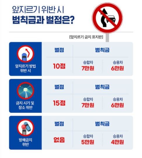 추월가 금지된 상황에서 시도하라 경우 차종에 따라 범칙금과 벌금이 부과됩니다.
