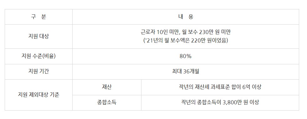 : 근로자 수 10명 미만인 사업에 고용된 근로자의 월평균 보수가 200만 원이라면 매월 88,800원을 지원받을 수 있습니다. (80% 지원)