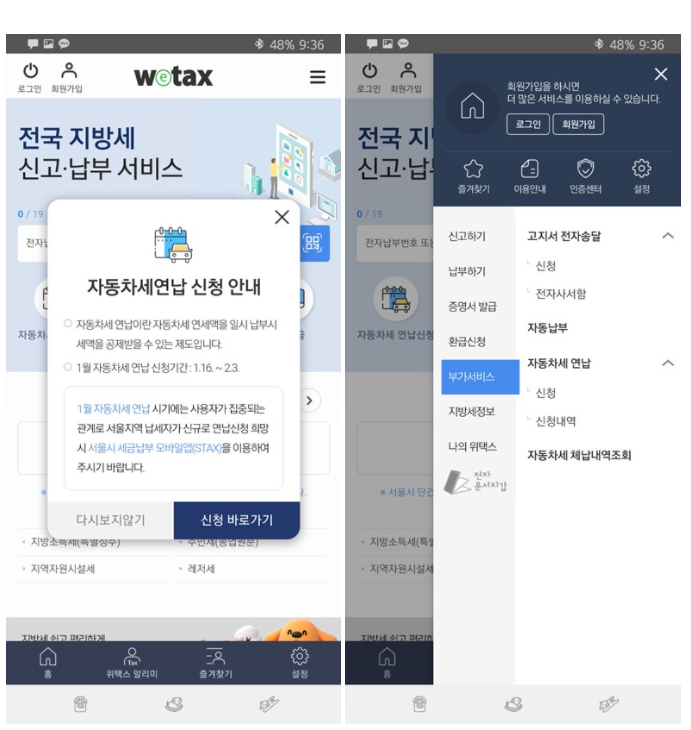 자동차세 연납 기간이다 보니 위택스 어플을 켜자마자 자동차세 연납 신청 바로가기 화면이 뜬다.