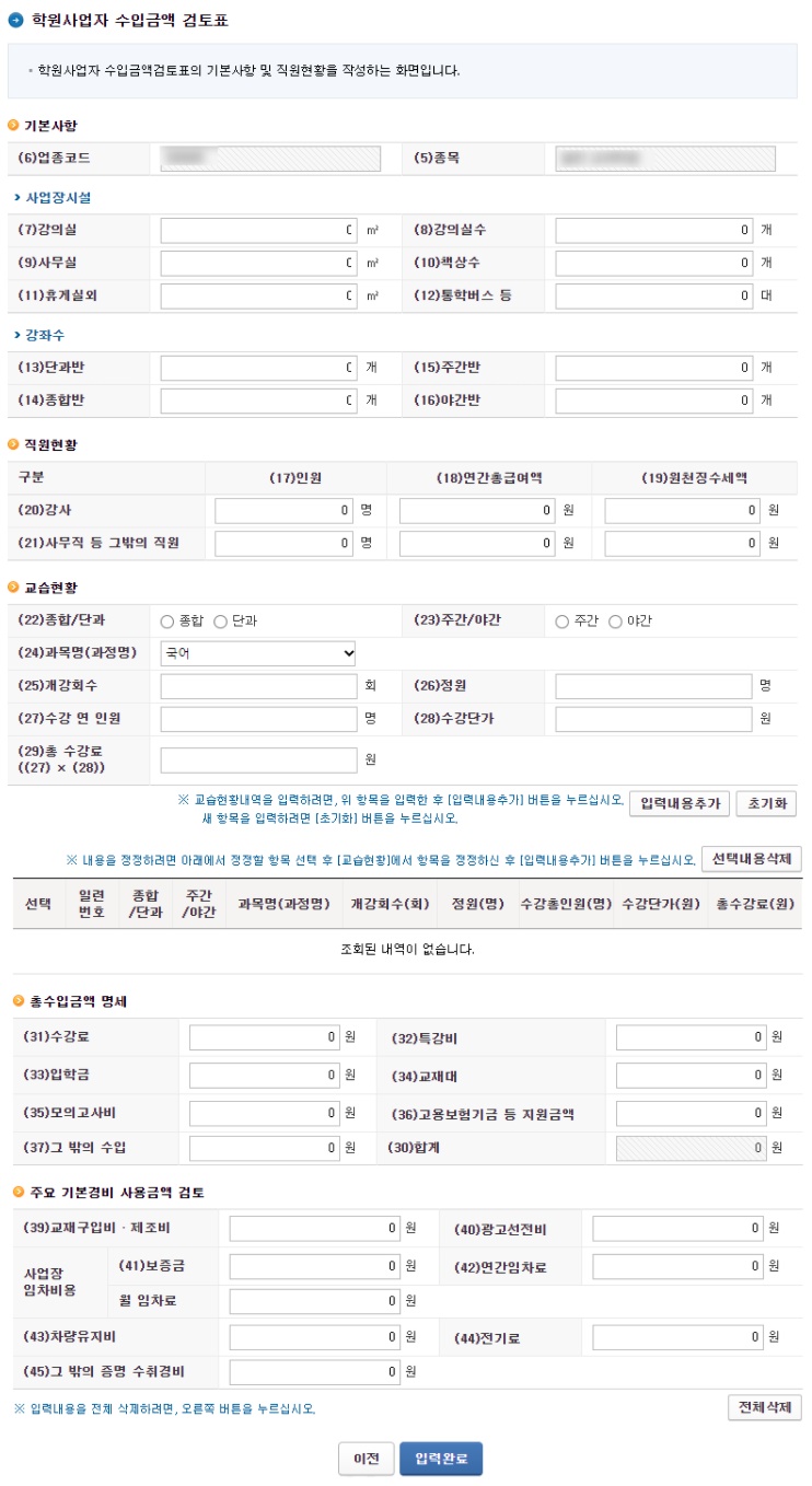 학원업종인 경우에는 수입금액검토표를 제출해야 하는데, 여러가지 기본사항과 사업장시설, 강좌수, 직원현황, 교습현황, 총수입금액명세 및 주요 기본경비 사용금액 검토를 기재하는 란이 있습니다.